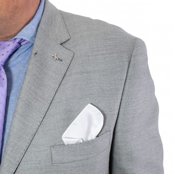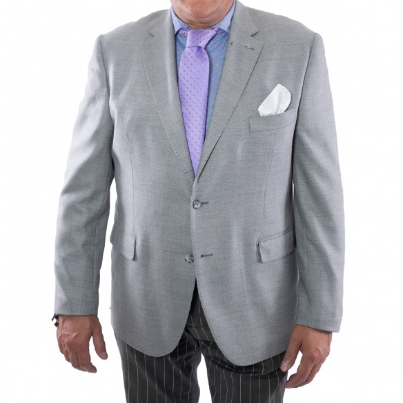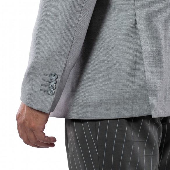 Giacca monopetto realizzata in lana, dettaglio di tasche con patta sui fianchi e taschino interno funzionale.