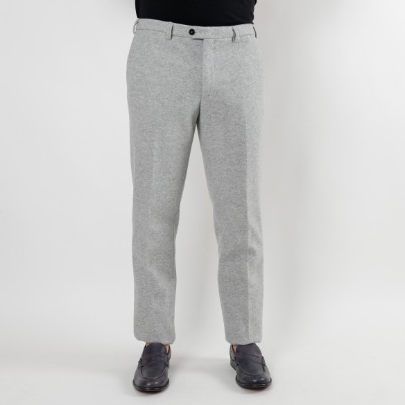 Questo è un pantalone classico in lana pesante al 100%. Il tessuto ha un aspetto morbido e caldo, ideale per le stagioni fredde. Il colore grigio chiaro conferisce un tocco elegante e versatile, facilmente abbinabile a diversi tipi di outfit.
