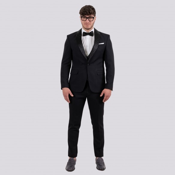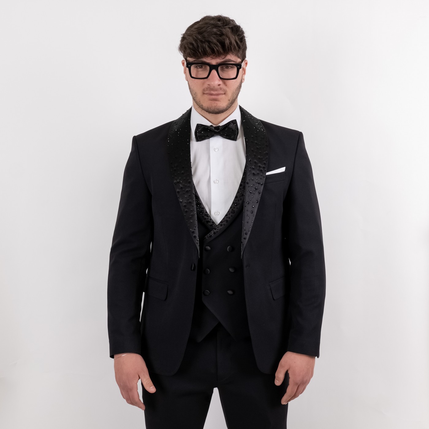 Smoking petto a scialle e rever in raso con strass, polsino con bottoni in raso. Tasche a filetto sui fianchi e taschino interno funzionale. Orlo con spacchi laterali. Chiusura frontale con abbottonatura.