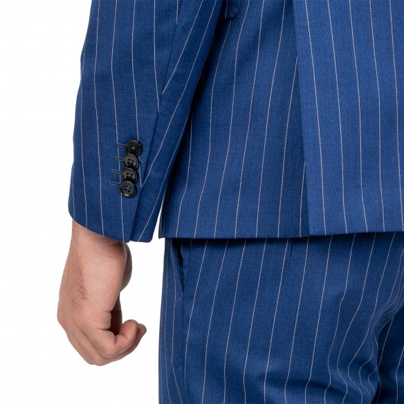 Il taglio doppio petto è una scelta classica e distintiva, con due file di bottoni sul davanti, che donano un aspetto sofisticato e strutturato. Il motivo gessato conferisce al capo un elegante effetto a zig-zag, spesso associato alla tradizione sartoriale inglese.