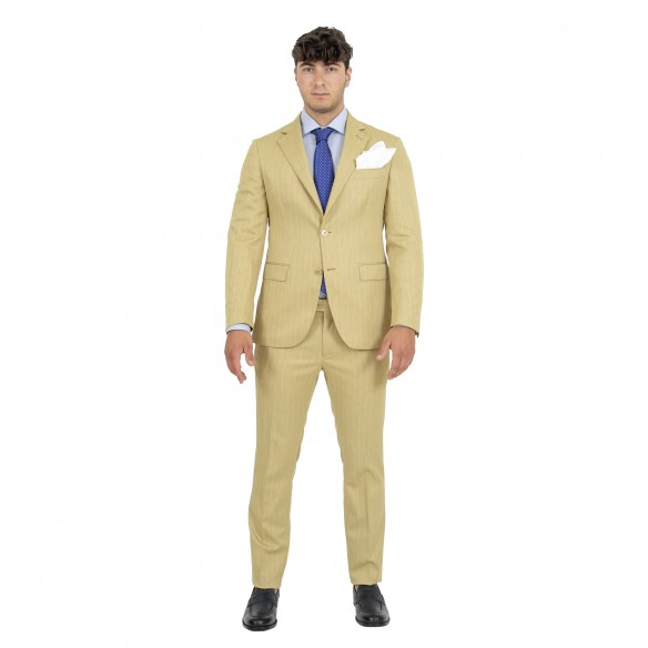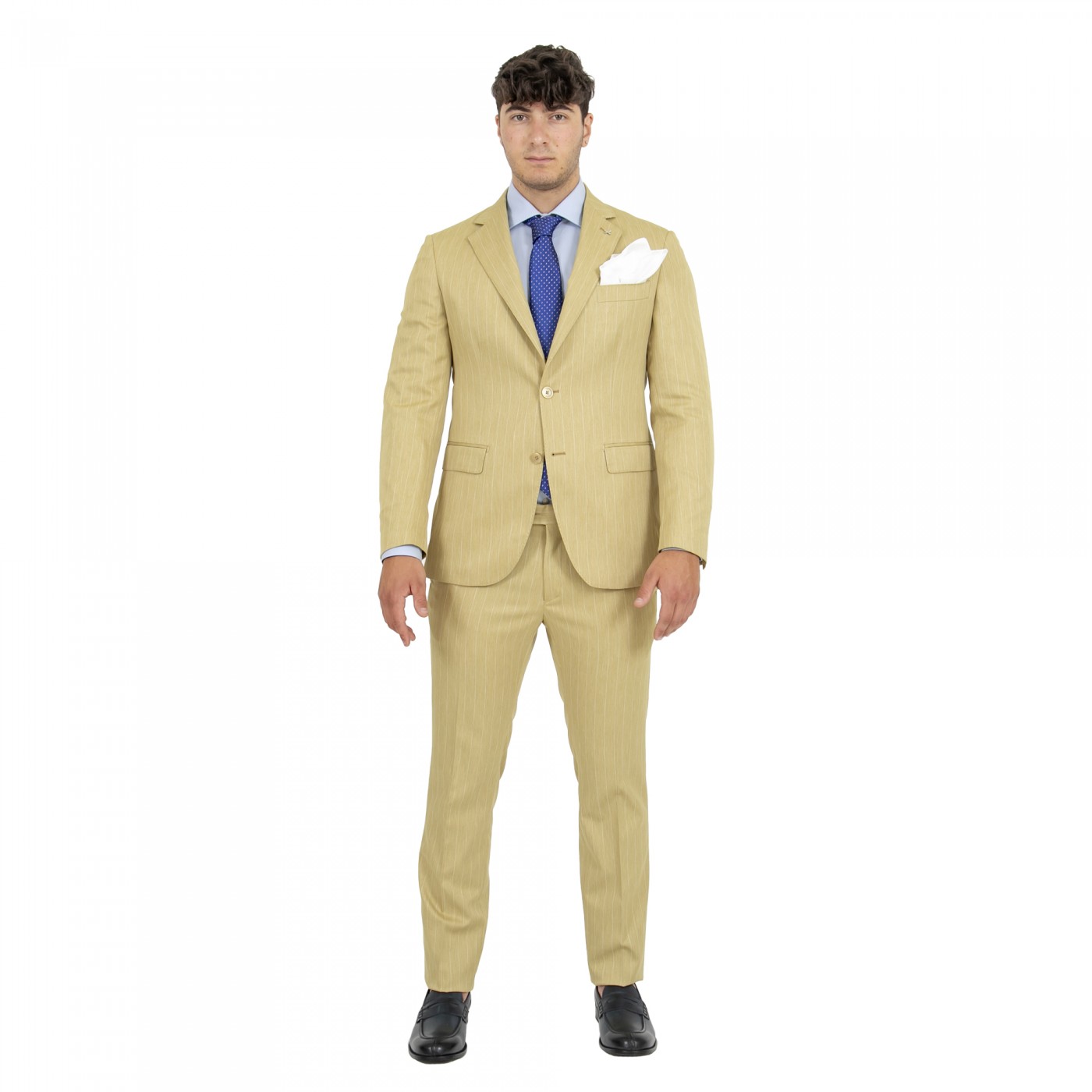 abito monopetto gessato blu in 100% lana è un capo classico ed elegante, perfetto sia per contesti formali che professionali.