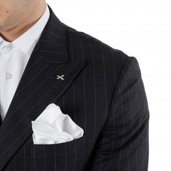 Abito realizzato in lana, doppio petto foderato. Tasche con pattina + taschino in petto e taschino interno funzionale, due spacchi posteriori.