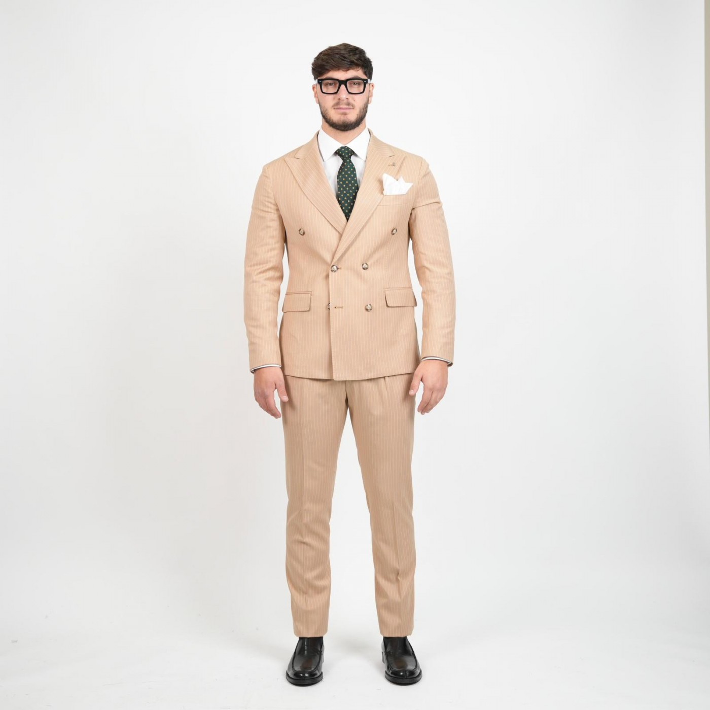 Abito doppio petto gessato in pura lana , interamente foderato e curato nei minimi dettagli. La giacca presenta rever a lancia che donano un tocco di eleganza decisa e moderna, tasche a pattina laterali e taschino sul petto. La chiusura a sei bottoni valorizza la linea, conferendo al capo un carattere sartoriale e senza tempo.