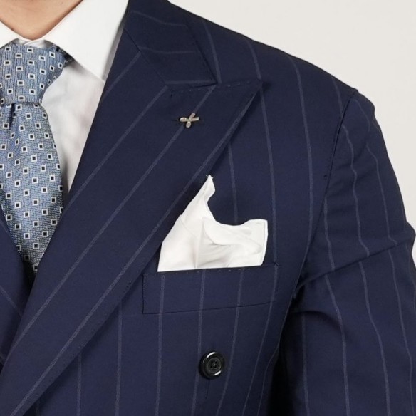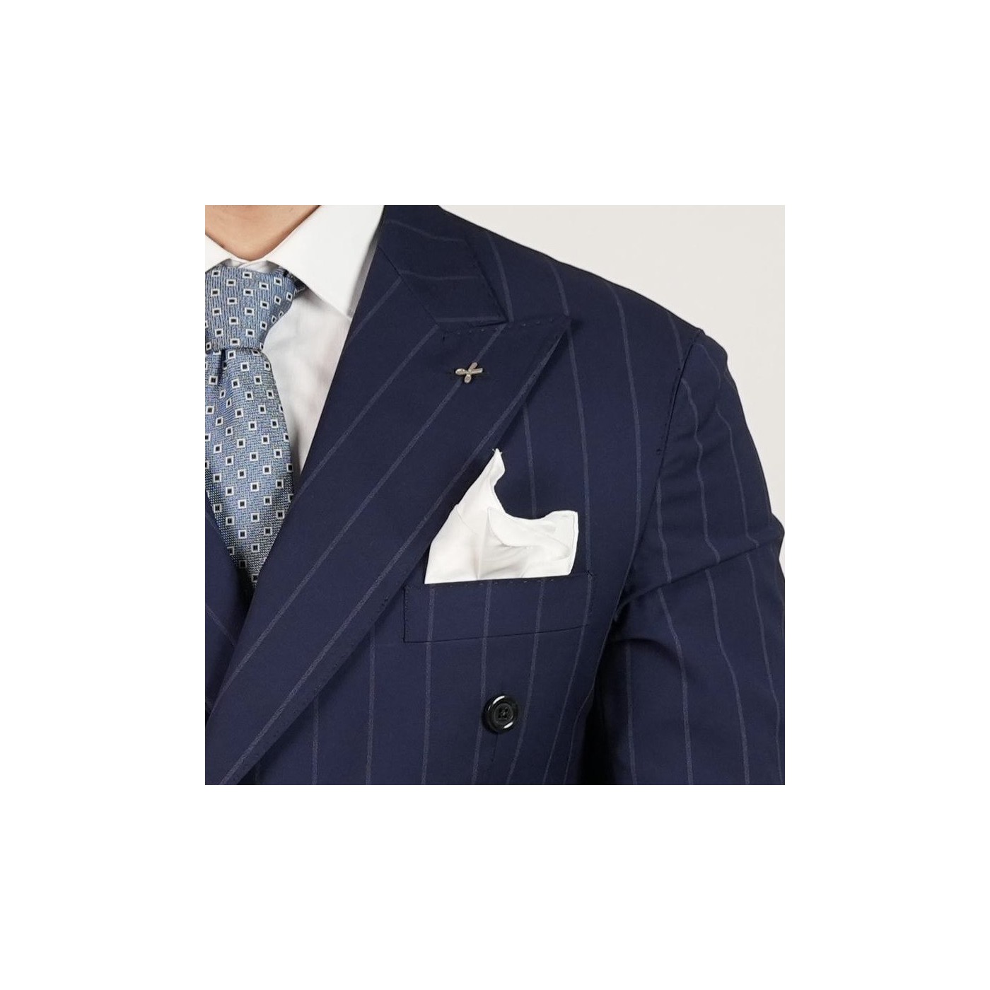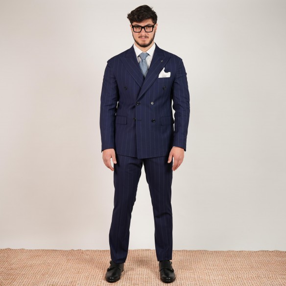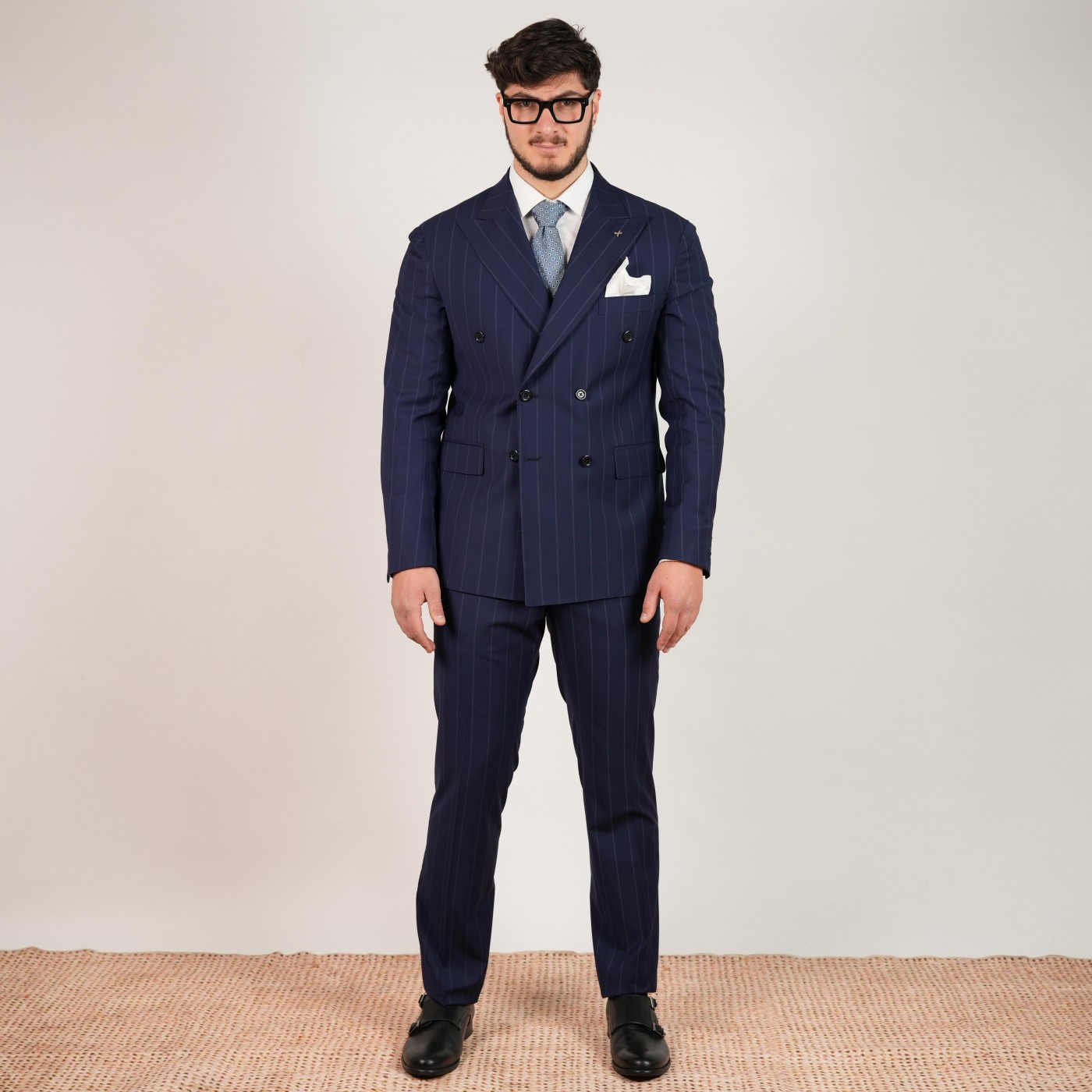 Abito realizzato in lana foderato , doppio petto a lancia . Tasche con pattina + taschino in petto , taschino interno funzionale, due spacchi posteriori.