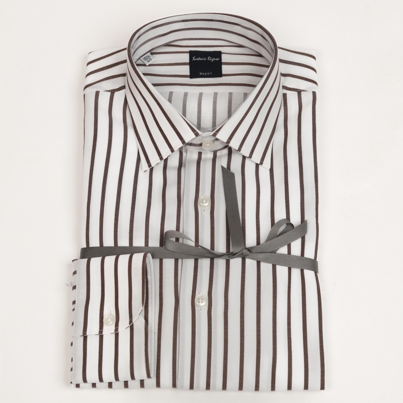 Camicia da uomo in 100% cotone, caratterizzata da una raffinata fantasia a righe marroni su base bianca. Il modello presenta una vestibilità moderna (Modern Fit), pensata per offrire comfort mantenendo una linea elegante e contemporanea.