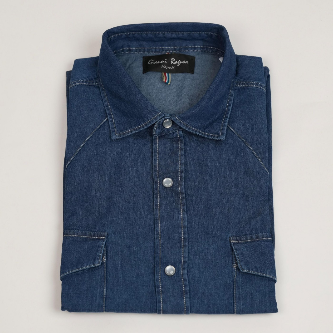 Camicia realizzata in denim di puro cotone, morbido e resistente, ideale per un look casual ma ricercato. Il design presenta un classico colletto, chiusura frontale con eleganti bottonimadreperla e cuciture a contrasto che valorizzano la struttura del capo.