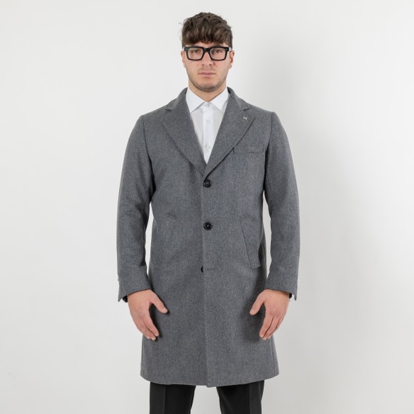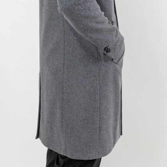 Cappotto realizzato in lana, revers a punta, tasche con patta sui fianchi e dettaglio di taschino interno funzionale. Orlo con apertura centrale posteriore. chiusura frontale con abbottonatura (3 bottoni)