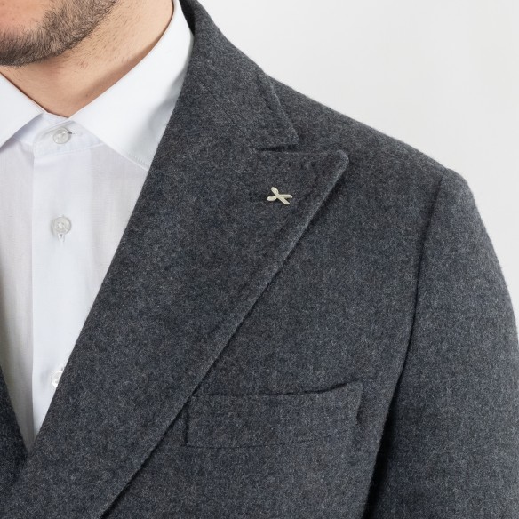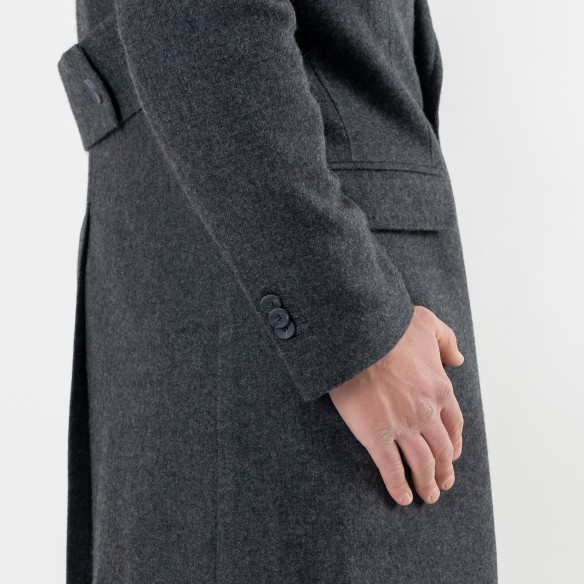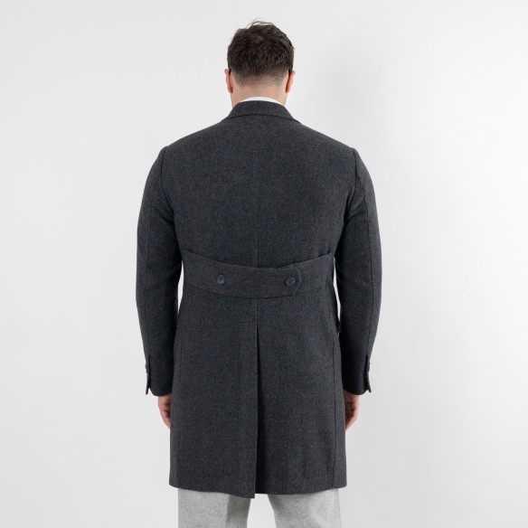 Cappotto abbottonatura doppio petto sfoderato, tasche pattina + taschino a barchetta in petto, martingala posteriore+ spacco centrale, tasche interne