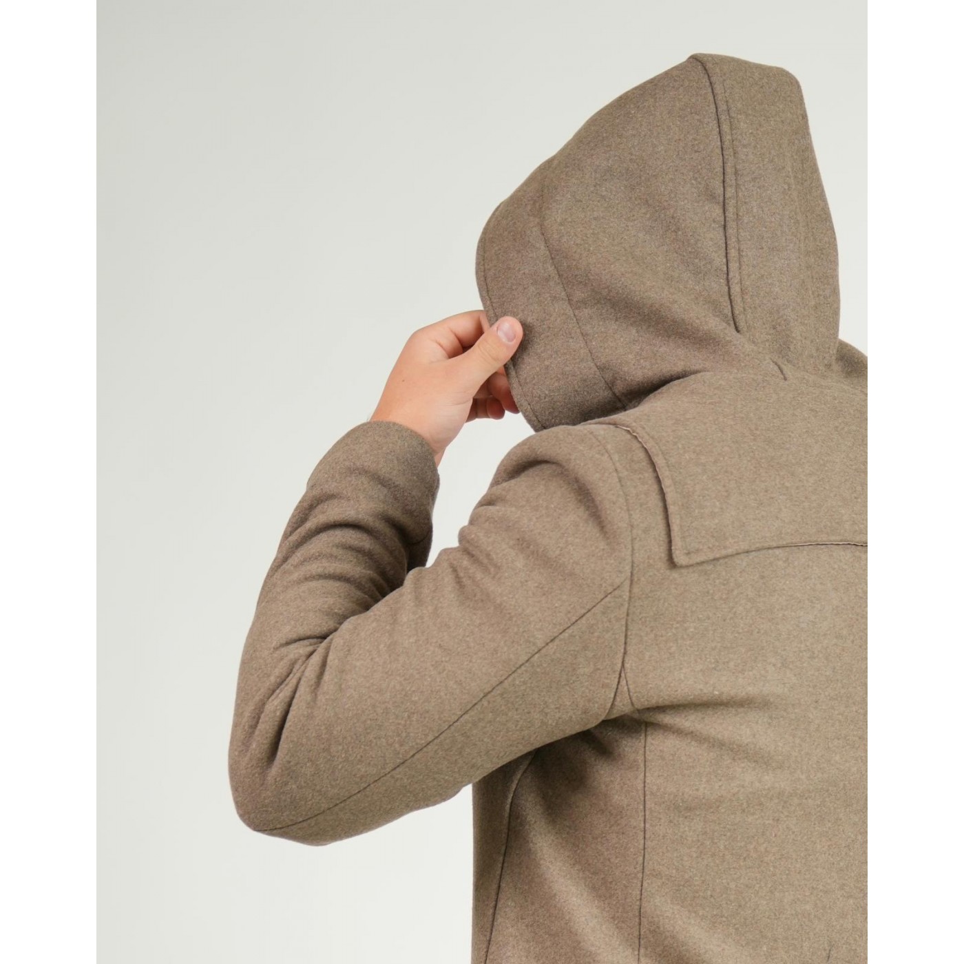 Classico montgomery, realizzato in lana con cappuccio inamovibile e due tasche scaldamani a pattine sui fianchi.