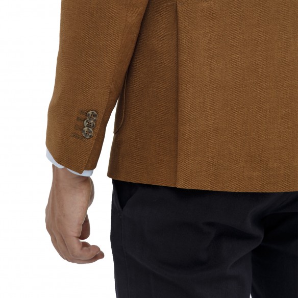 Giacca due bottoni con revers classici, mezza fodera, tasche a toppa , taschino interno funzionale . Due spacchi sul retro. Chiusura frontale monopetto.
