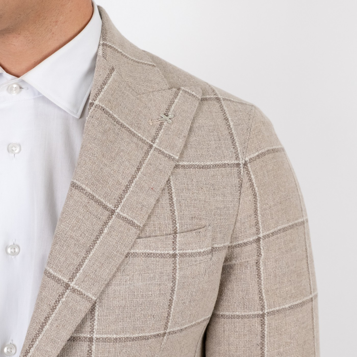 La giacca in foto è realizzata in 100% lana su base beige cammello e linee sottili color moro. Ha un taglio moderno con revers a lancia, due bottoni frontali e tasche a pattina. La texture della lana conferisce un aspetto caldo e raffinato, adatto sia per occasioni formali che per look casual-eleganti. L’interno appare non eccessivamente strutturato, il che ne migliora la vestibilità e il comfort