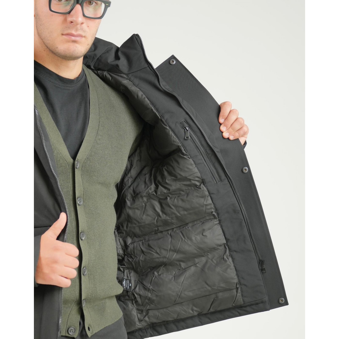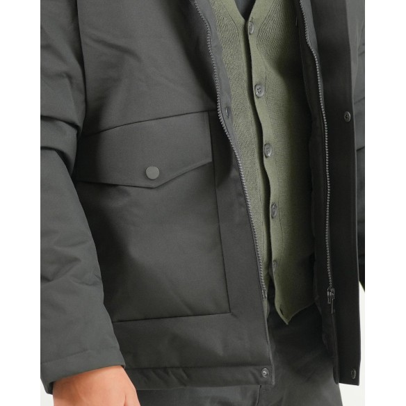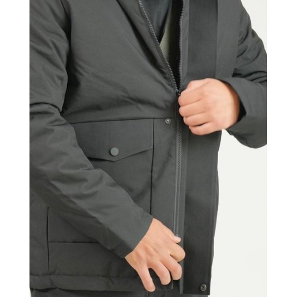 Chiusura frontale con cerniera a tutta lunghezza protetta da patta con bottoni a pressione per una maggiore tenuta contro pioggia e vento.