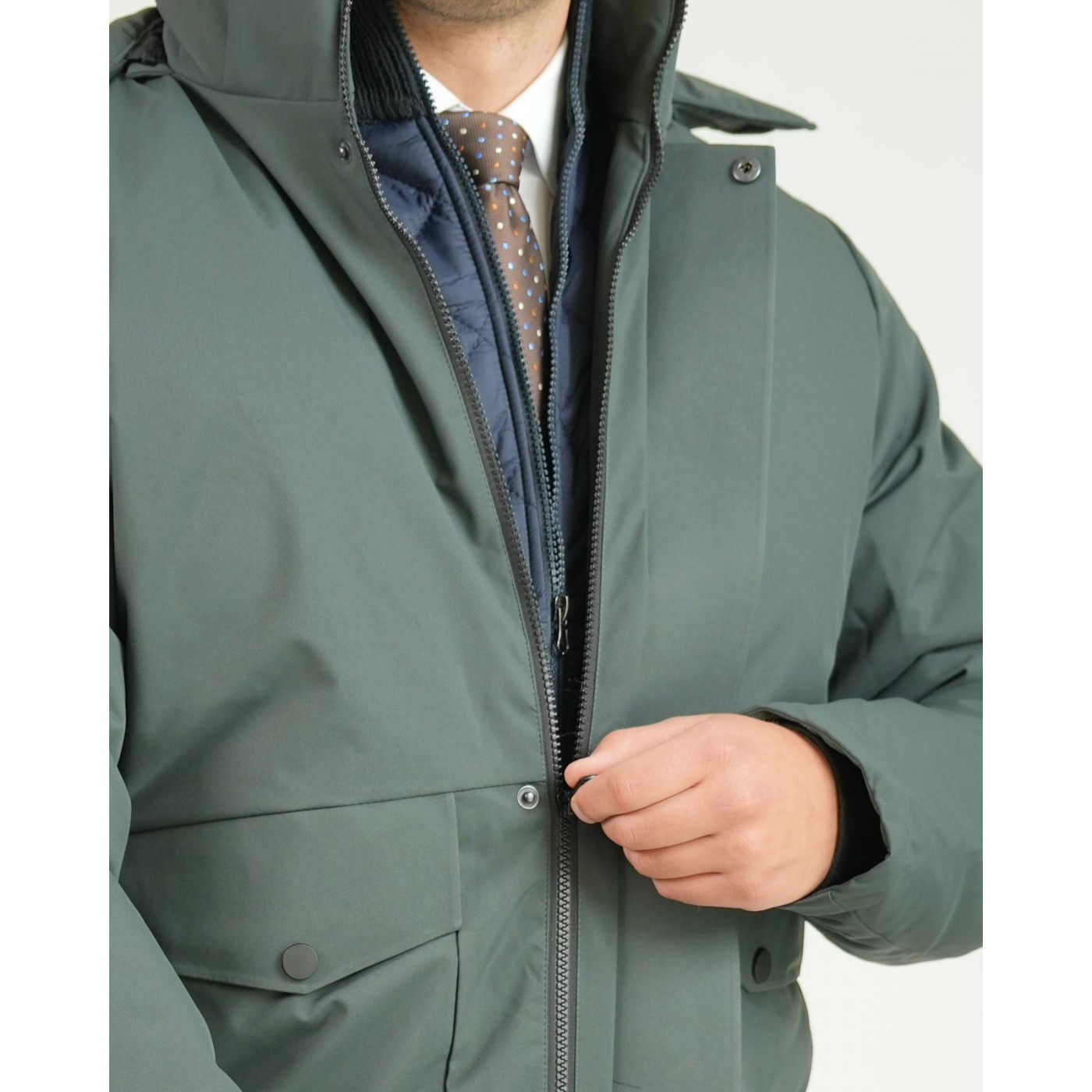Chiusura frontale con cerniera a tutta lunghezza protetta da patta con bottoni a pressione per una maggiore tenuta contro pioggia e vento.
