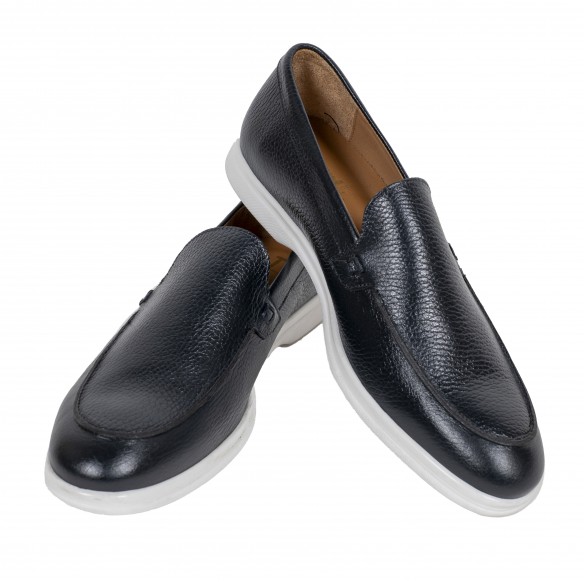 Il mocassino blu in pellame bottolato è un modello elegante e raffinato, realizzato in pelle di alta qualità con finitura bottolato, che conferisce una texture leggera e leggermente opaca, caratterizzata da piccole irregolarità naturali sulla superficie. Questo tipo di pelle è resistente e durevole, ma allo stesso tempo morbida e confortevole. Il colore blu aggiunge un tocco di classe, rendendo la scarpa versatile e adatta sia a look casual che formali. Il design del mocassino è essenziale e senza tempo, con una forma slip-on che garantisce facilità d'uso e una calzata comoda. Perfetto per chi cerca un'interpretazione moderna di un classico intramontabile.