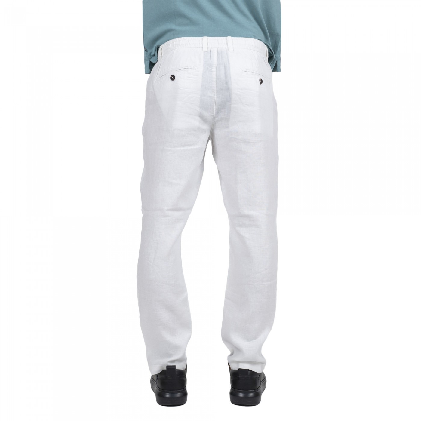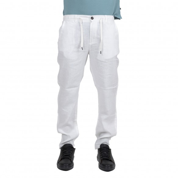 Pantalaccio biancoregular fit tasca america e due tasche a filetto posteriori. Abbottonautura anche con laccioMade in ItalyLino e cotone