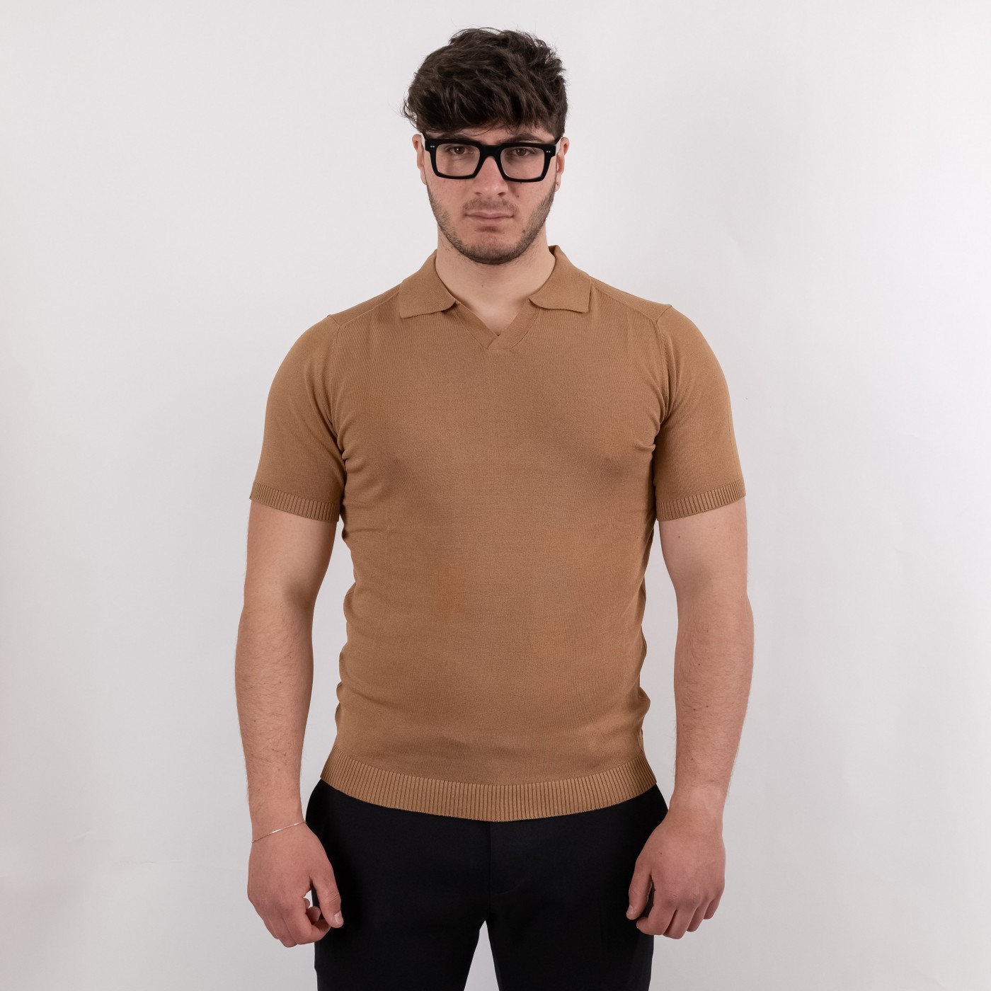 polo a maniche corte di colore cammello. La polo ha un colletto classico con scollo a V senza bottoni, e il tessuto è morbido ed elastico, in misto cotone. Le maniche e il fondo della maglia presentano un bordo a costine, conferendo un aspetto aderente e curato. Il design è semplice ed elegante, ideale per un look casual ma raffinato.